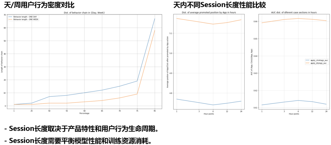 Airbnb的经验是将Session划分为2周,58招聘则进行不同的尝试;上图左半部显示的是将Session划分为1天或1周时的用户行为密度对比,其中蓝色表示划分间隔为1天,黄色为1周,图中纵轴表示用户不区分点击或投递的行为链长度,纵轴表示长度所占百分比,可以看出差异并不显著,故初步选定为1天;上图右半部显示的是天内不同Session长度性能比较,左图表示不同划分时平均推荐位置排序,越小表示相关结果的推荐越靠前,右图表示预测结果的AUC,越高代表预测结果越准确,两个度量指标均为6小时划分最优;Session长度取决于产品特性和用户行为生命周期;Session长度需要平衡模型性能和训练资源消耗。