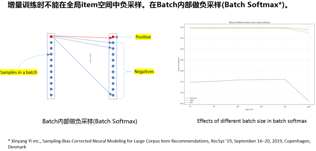 实时召回时要对模型进行在线的增量更新,无法使用离线时的负采样操作;我们参考了Youtube团队19年提出的batch softmax方法,在batch内进行负采样,具体细节请参考论文[1]。
