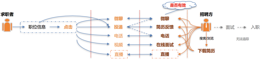 求职者进入App后,会在展现的职位信息中产生行为,如直接投递简历,或者点击进入职位详情页后通过简历投递、IM、电话等多种方式与招聘方交互;