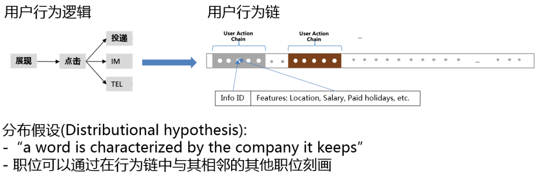 在语言学中,分布式假设可以表述为:一个单词的特征可以被总和它一同出现的单词所描述。我们自然可以联想到:职位可以通过在行为链中与其相邻的其他职位刻画。当然这只是一种假设,并没有严格的证明。