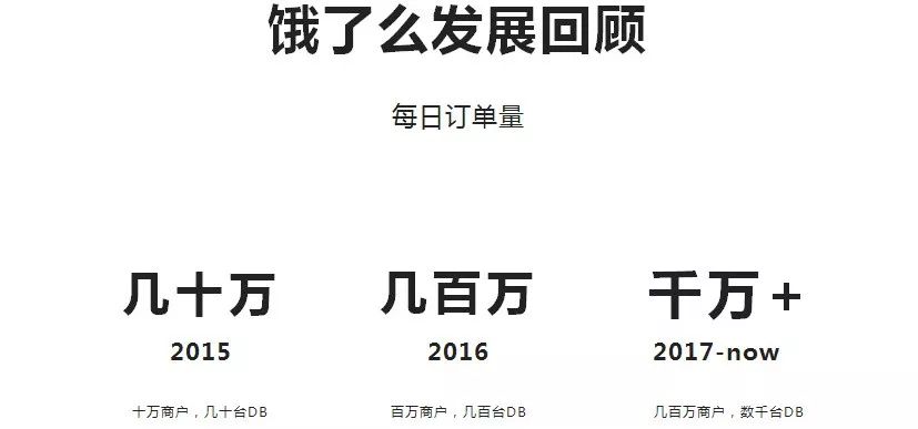 饿了么发展最快阶段也是最近四五年的事情,我是2015年进入饿了么的,那时每天才几十万的订单,服务器也不多;到了2016年时每天订单达到了几百万,商户也更多了;而2017年不管是订单、运单都是千万以上,直到现在都还在快速增长。