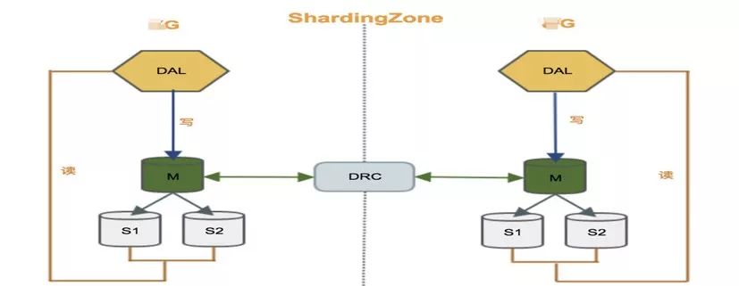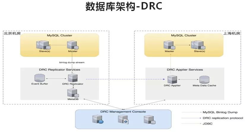 数据同步组件DRC,实现的功能是在一边机房接受变更日志,并把变更日志传递到其他的机房去,其他机房再能把这个变更应用上。