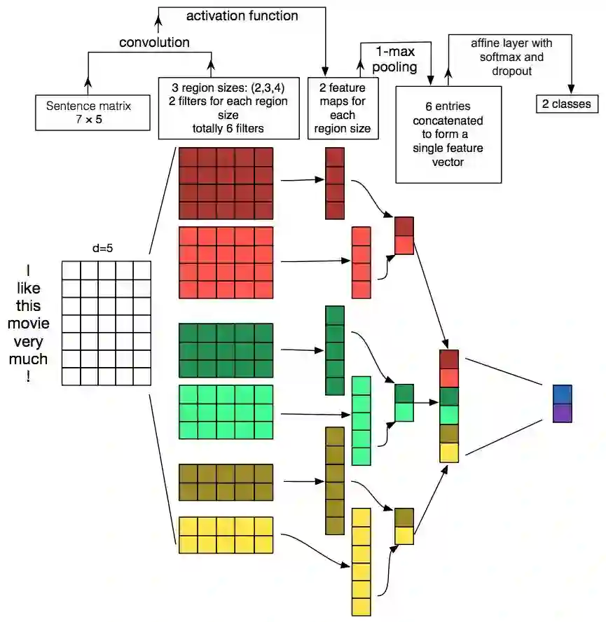卷积神经网络 (CNN) 一直以来的主要应用都是在基于图像的深度学习算法上。近些年 CNN 在自然语言处理上的应用证明,CNN 系列的算法可以高效的对语言进行建模,在更快的执行速度下,达到或超过 GRU/LSTM 的效果。以短文本分类为例,CNN 在这一问题上的应用如下图所示:
