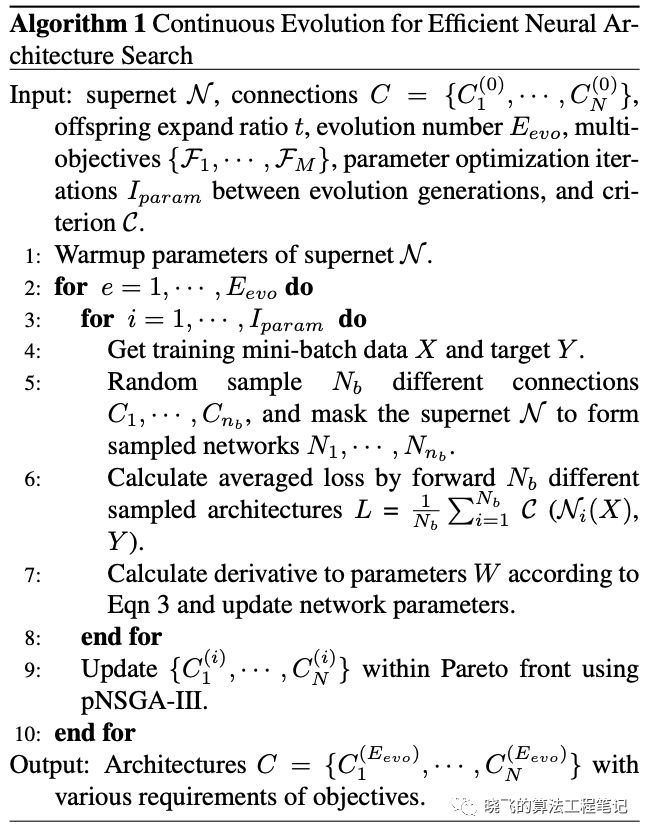 论文使用基因算法(GA)来进行结构进化,GA能提供很大的搜索空间,对于结构集 , 为种群大小。在结构优化阶段,种群内的结构根据论文提出的pNSGA-III方法逐步更新。为了加速,使用一个超网 用来为不同的结构共享权重 ,能够极大地降低个体训练的计算量