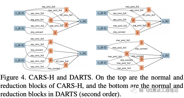 CARS-H与DARTS参数相似,但准确率更高,CARS-H的reduction block包含更多的参数,而normal block包含更少的参数,大概由于EA有更大的搜索空间,而基因操作能更有效地跳出局部最优解,这是EA的优势
