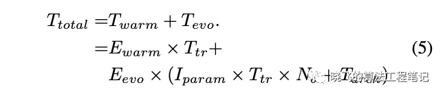 CARS搜索时,将数据集分为数据集和验证集,假设单个网络的训练耗时为 ,验证耗时 ,warmup共 周期,共需要 时间来初始化超网 的参数。假设进化共 轮,每轮参数优化阶段对超网训练 周期,所以每轮进化的参数优化耗时, 为mini-batch大小。结构优化阶段,所有个体是并行的,所以搜索耗时为 。CARS的总耗时如公式5
