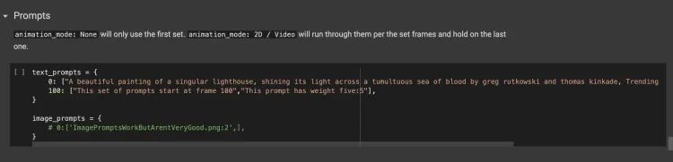图源:Disco Diffusion程序截图 第三部是最关键的,即对所想生成的画作进行描述。打开程序“Prompts”(描述词)部分,初始页面内给出的默认描述词为“A beautiful painting of a singular lighthouse, shining its light across a tumultuous sea of blood by greg rutkowski and thomas kinkade, Trending on artstation.", "yellow color scheme"