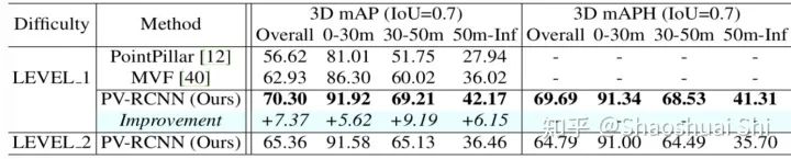 我们先看看PV-RCNN 3D检测框架的性能如何。说到底,做high-level的,大多数还得硬碰硬 (不然难免故事吹的天花乱坠,一跑AP只有0.5。。