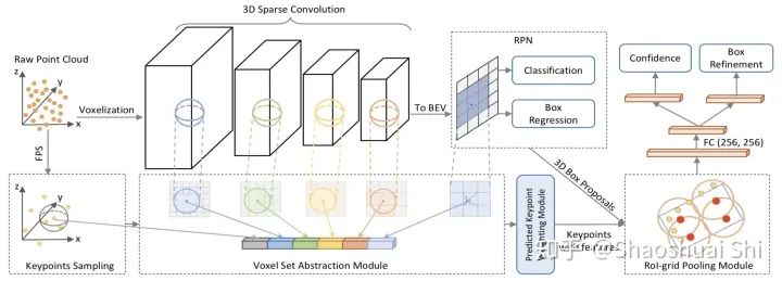因此,我们接着考虑,怎么能将整个场景编码到少量的keypoint上,用这些point-wise的keypoint特征来做第二阶段的RoIPooling,也就是将其作为桥梁,来连接检测框架的两个阶段。