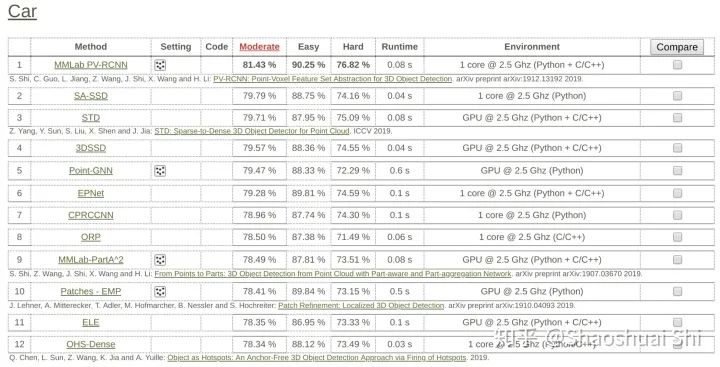 我们是去年11月提交的PV-RCNN结果,大幅领先之前的SoTA算法,且保持第一大半年一直到现在(最近出现很多新方法,估计也该被别人挤下去了。。
