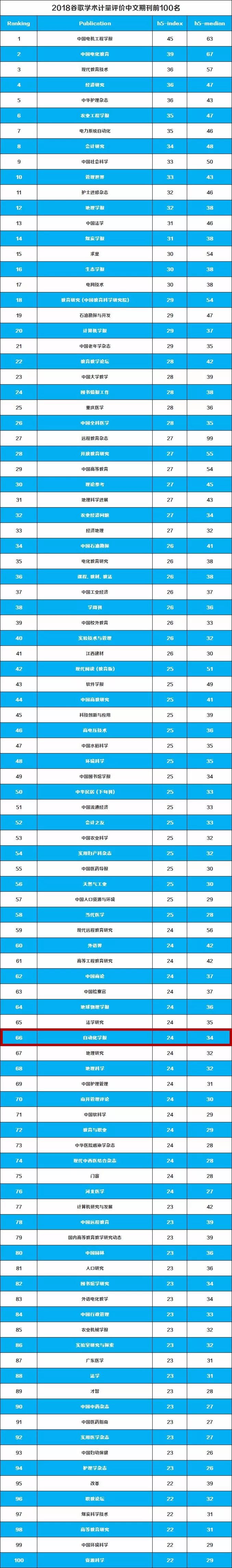 近期,谷歌学术(Google Scholar)公布了2018年最新的学术期刊/会议影响力排名,自动化所主办的学术期刊《自动化学报》进入中文期刊TOP100,排名位于第66位。