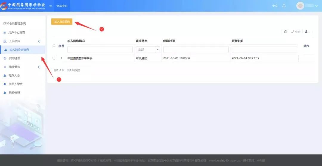 http://membership.csig.org.cn/,选择左侧栏中的加入的分支机构,然后点击右侧加入分支机构按钮。