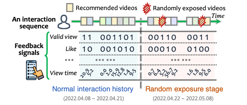 而KuaiRand数据集,是这样视频序列推荐场景中第一个插入了随机视频的数据集。下图展现了某个用户的一个视频推荐流。时间跨度从2022年4月08日到2022年5月8日。四周的数据被分为两部分,前两周的数据均是正常推荐的视频,而后两周的数据则在正常推荐流中的任意位置以小概率插入了随机的视频。本次发布的数据集忠实地公布了15个推荐场景(不同页面)中用户对所有推荐视频的12种反馈。