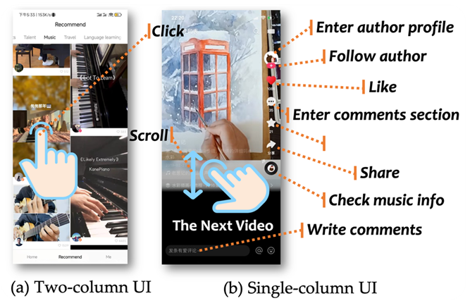 如今短视频成为人们熟知的内容载体。上图展现了快手的视频推荐界面,左边是双列界面,需点击特定视频才能播放;右边是单列的界面,默认自动播放,上下滑可切换到下一个视频。页面上有大量的交互按钮,如“喜欢”、“转发”、“分享”等,均可作为用户对推荐视频的反馈信号。