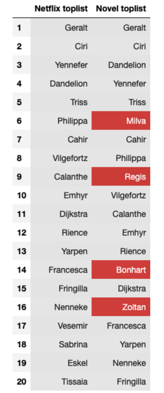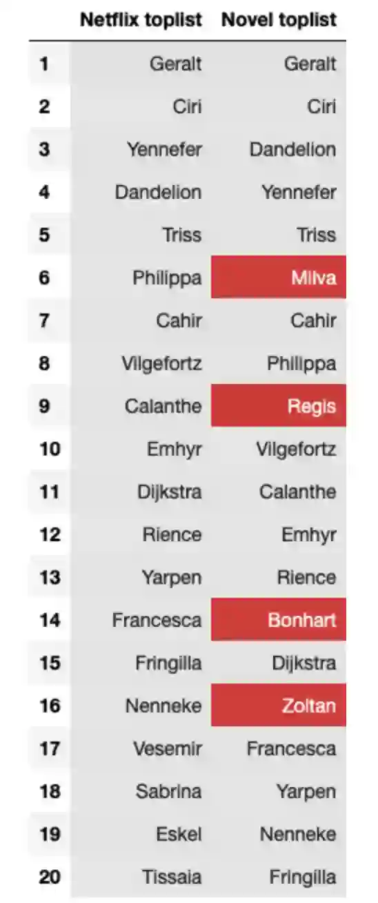 第二栏用红色显示了出现在小说排行榜上的人物,但在Netflix剧集中没有出现。