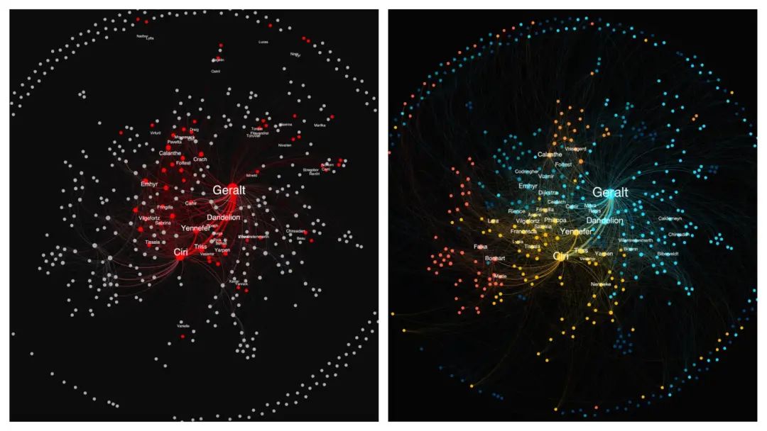 不难看出,这个网络包含两个主要的社区: 一个以Ciri为中心,另一个以Geralt为中心。