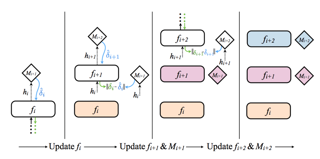 让我们聚焦左边的第二块区域。看到了没有?梯度(Mi+2)经fi+1反向传播至Mi+2。如你所见,每个合成梯度生成器实际上仅仅使用下一层生成的合成梯度进行训练。因此,只有最后一层实际在数据上训练。其他层,包括合成梯度生成网络,基于合成梯度训练。因此,训练每层的合成梯度生成网络时,只需等待下一层的合成梯度(没有其他依赖)。太酷了!