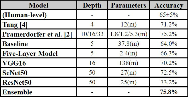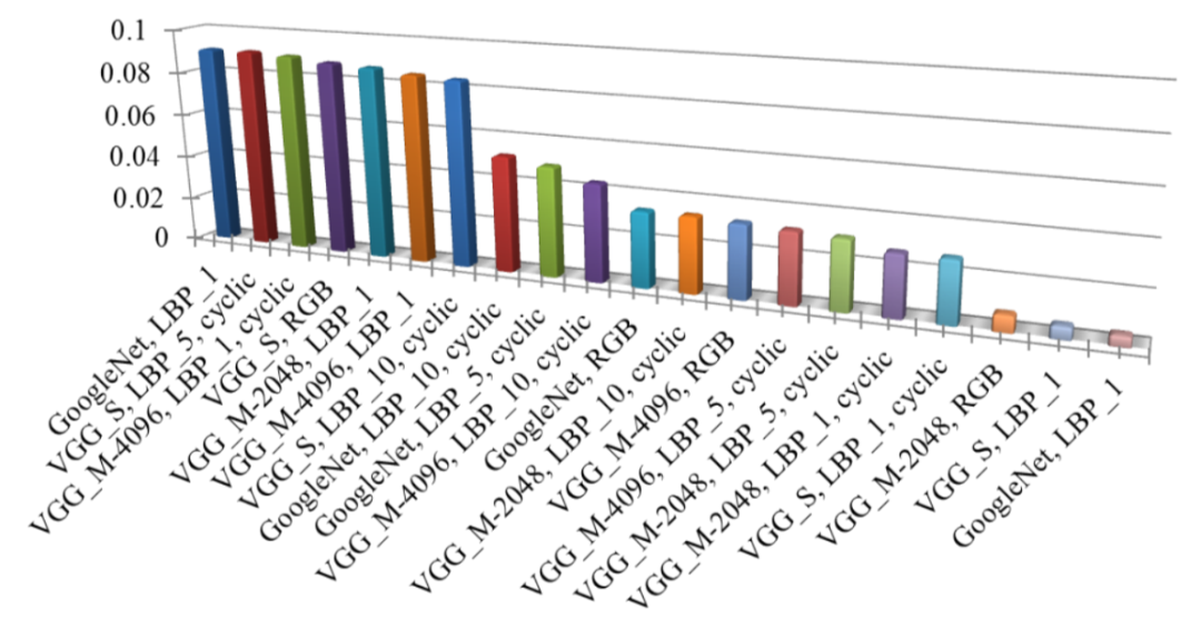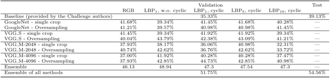 下表总结了所有不同网络架构和图像表示的验证集结果。用于 LBP 表示的下标表示使用的参数的值。实验结果显示,这些特征是通过梯度直方图金字塔产生的特征和局部相位量化从对齐的人脸中提取,并使用单独的支持向量机融合进行分类。集成结果大大提高了性能,性能显著提高了 40%(提高了15.36%)。