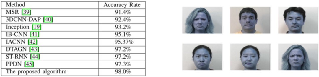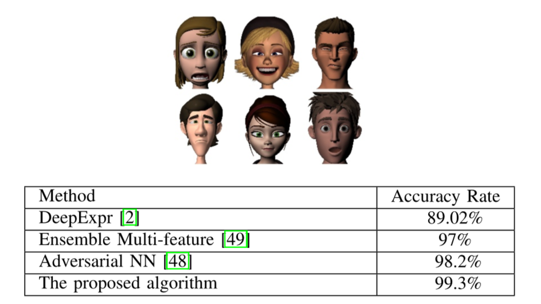 本文提出的模型在 FERG 数据集测试,首先使用大约 34k 个图像进行训练,14k 用于验证,7k 用于测试。对于每个面部表情,随机选择 1k 图像进行测试。由下表可知模型识别的准确率在 99.3% 左右,其它的识别效果都要好。