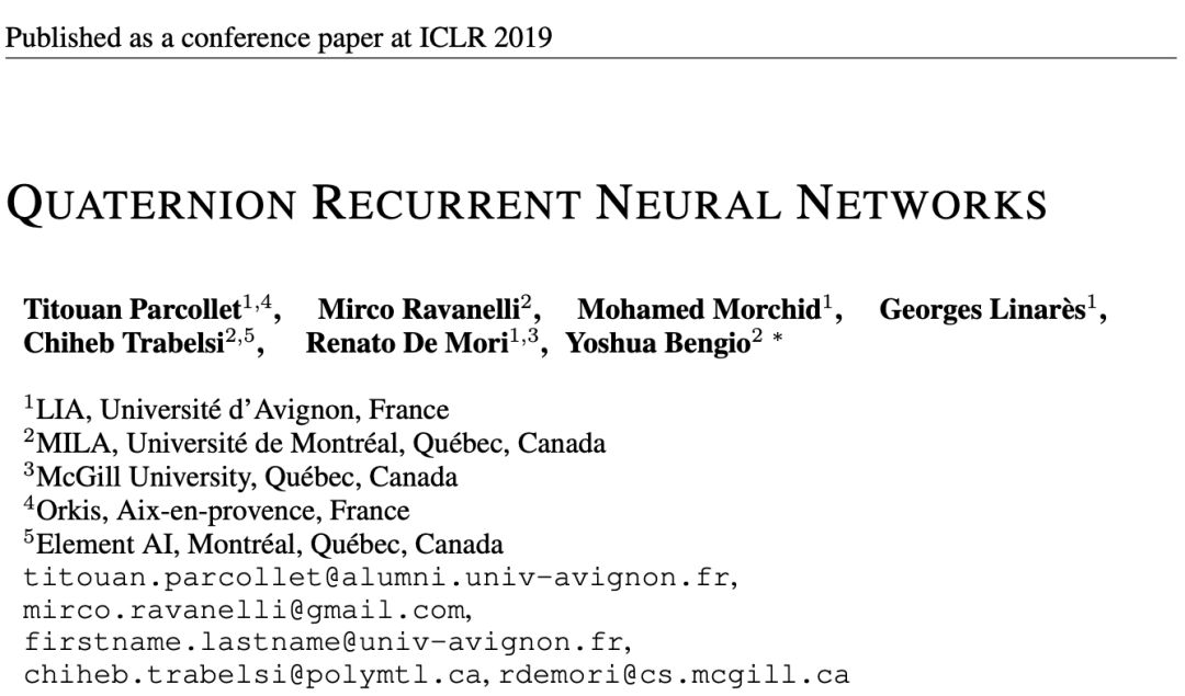 近日,Yoshua Bengio 等人提出了一种新型的循环神经网络,其以四元数来编码序列输入,称为四元循环神经网络。四元数神经网络是流形网络和胶囊网络之外又一种非同构表征架构,也可以看成是实值、复值 RNN 的扩展。实验表明,该网络相比传统的实值 RNN 可以显著减少参数数量,适用于低资源应用。相关论文已被 ICLR 2019 接收,评审得分为 7、7、8。