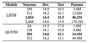 表 1:QRNN 和 RNN 模型在 TIMIT 数据集的开发集和测试集上的音素误差率(PER%)。「Params」代表可训练参数的总数量。