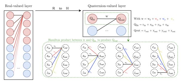 图 1:基于 Hamilton 乘积(等式 5)的四元权重共享,与标准实值层(左)相比,四元值层(右)的输入特征(Qin)潜在关系学习能力图示。