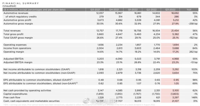 今日,特斯拉汽车公布了其 2022 财年第三季度财报,特斯拉汽车第三季度总营收为 214.54 亿美元,与去年同期的 137.57 亿美元相比增长56%,而上一季度为 169.34 亿美元。特斯拉汽车第三季度调整后每股收益超出华尔街分析师预期,但营收未能达到预期,从而导致盘后股价下跌逾 3%。马斯克表示,特斯拉的市值有可能超过苹果和沙特阿美的总和。截至目前,特斯拉市值为 6958 亿美元,苹果市值为 2.31 万亿美元,沙特阿美市值为 7.86 万亿沙特里亚尔(约 2.09 万亿美元)。