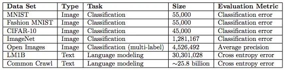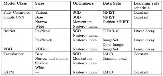 下表是实验用的模型,它们都是从业者会在各类任务中使用的主流模型。表中也展示了我们用于每个模型和数据集的学习率。学习率的作用是加速神经网络训练,但找到最佳学习率本身是一个优化问题。