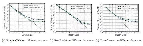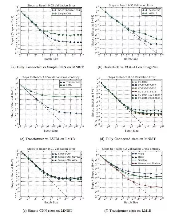 下图不同模型下batch size和训练步骤之间关系变化。其中a、b、c三个模型的最大有用batch size比其他模型大得多,d和f表明改变神经网络的深度和宽度可以影响模型利用较大batch size的能力,但这种做法只适用于同模型对比,不能推广到不同模型架构的对比中。