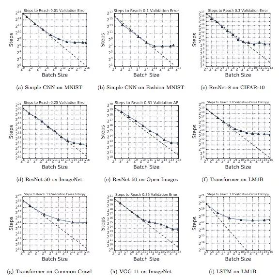 下图展示了不同workload下batch size和训练步骤之间关系变化。可以发现,虽然使用的神经网络、算法和数据集不同,但这九幅图都表现出了同样的特征,就是在初始阶段,随着batch size逐渐增加,训练步骤数会有一段线性递减的区间,紧接着是一个收益递减的区域。最后,当batch size突破最大有用batch size阈值后,训练步数不再明显下降,即便增加并行线程也不行。