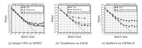 相比一般SGD,具有动量的SGD(以及Nesterov动量)的最大有用batch size更大,这意味着未来大家可以研究不同算法和batch size缩放属性之间的关系。
