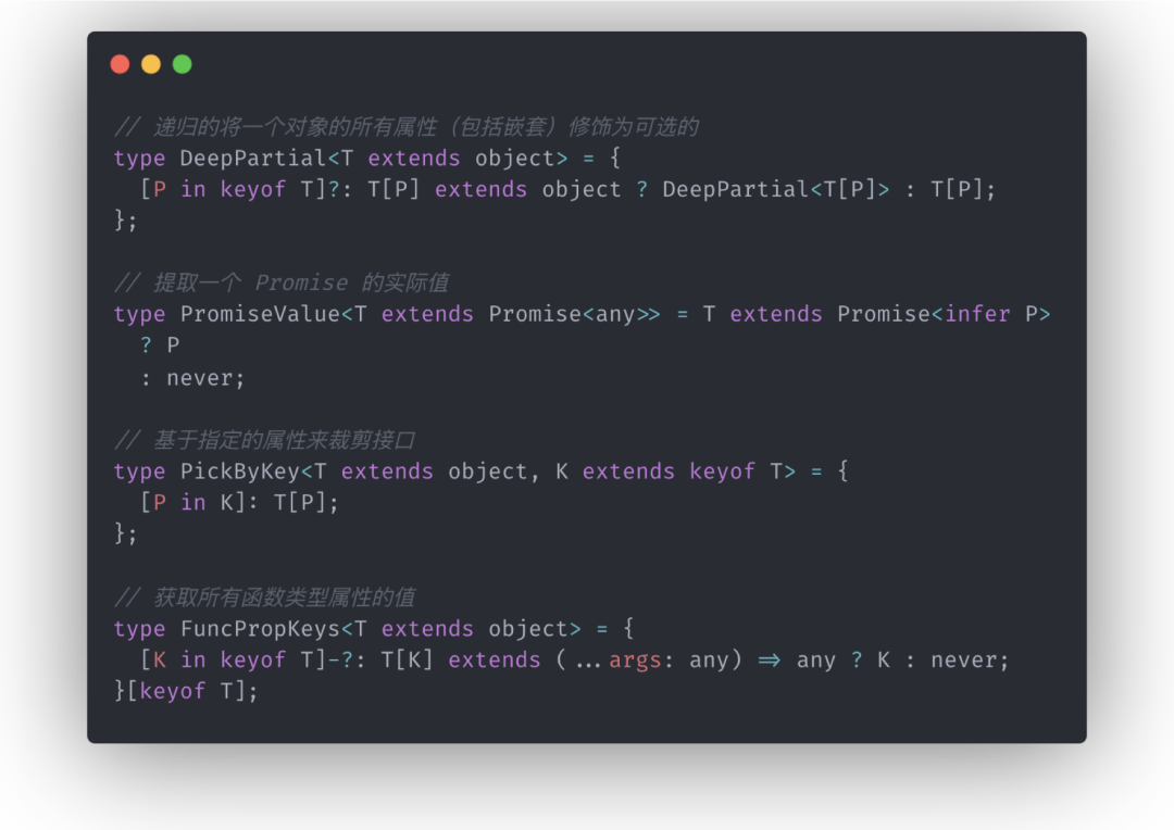 最重要的一点,类型不求多但求精,精确地类型代码意味着你事先已经基于整个项目的逻辑进行了预先设计,每一处逻辑都有对应的类型代码支撑,它们彼此之间是紧密关联的。这样的类型代码完全能够替代许多不必要的逻辑注释。我们接下来来看几个常见的 TypeScript 代码方面的内容,进一步了解一下优雅之于 TypeScript 代码:
