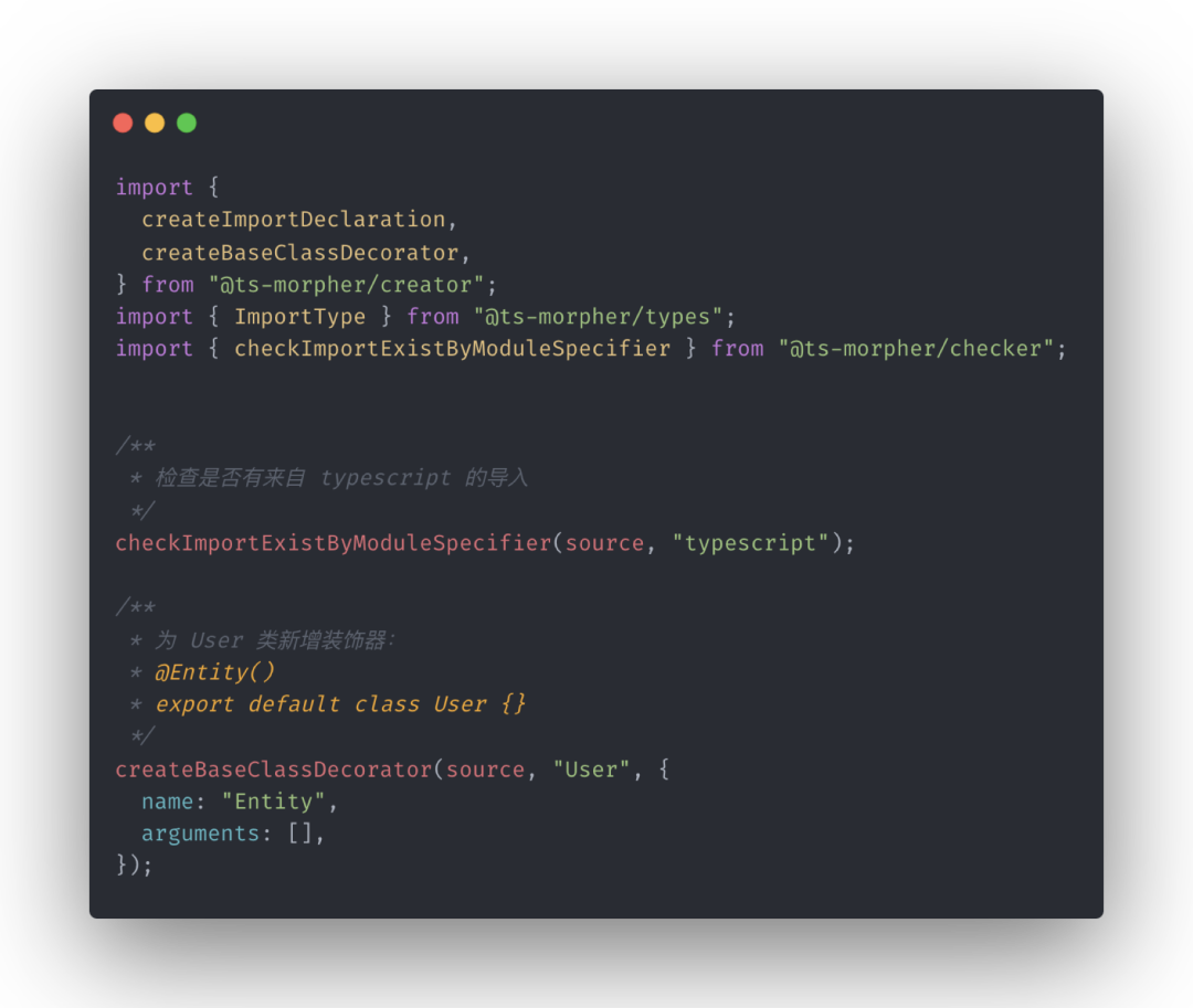 是的,这一波操作其实我们只生成了三行代码。如果我们需要进行的操作复杂度提高一些,实际使用 Compiler API 的成本也会暴涨。前面说到对于编译原理知识的储备,也就意味你需要了解 SynatxKind、Statement 这些 AST 子节点,你需要了解它们在 AST 中的作用,在实际源码中都代表着什么,同时 TypeScript 的 AST 还存在类型相关的部分,就进一步带来了理解成本。所以你可能会想,能不能把这些 API 封装起来,至少屏蔽一部分编译原理的知识?事实上社区也的确有这样的方案,即 ts-morph。