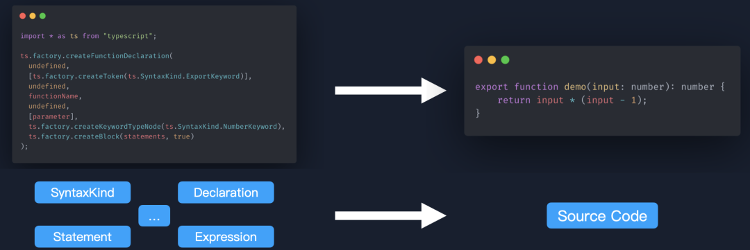 而要做源码级约束,由于我们需要关注类型,很显然最好的方式是使用 TypeScript 自己的 Compiler API 来做,你可以简单的理解为类似 Babel 系列的包。但 Compiler API 存在着一定的使用成本,它需要你有一定的编译原理知识储备,比如看上面的这张图,创建 Identifier、TypeNode、Declaration、Expression、Statement 等等,我们看一下这一段代码最后生成了什么样的 TypeScript 代码: