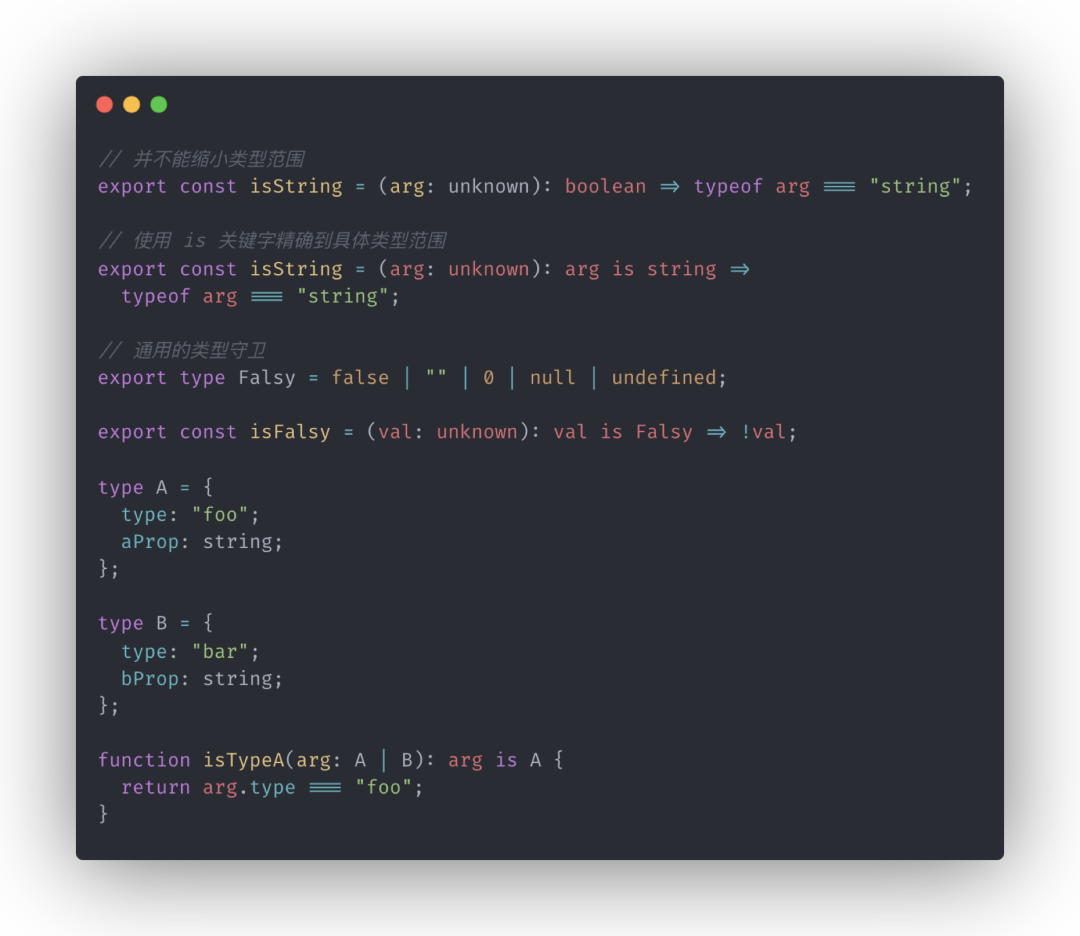 其实,更理想的做法是使用类型守卫,通过实际层面的逻辑判断,比如是否包含某个字段,某个字段是否是正确类型,结合 TypeScript 的 is 关键字来在实际使用时去精确地收窄类型。我们可以使用 typeof、instanceof、真值假值判断或者是专门用于区分接口的字段(即可辨识属性),比如这里 type A 和 type B 称为可辨识联合类型,其中就存在着专用于守卫的可辨识属性,在实际场景中我们会经常遇到的则有登录用户与访客用户的字段差异。