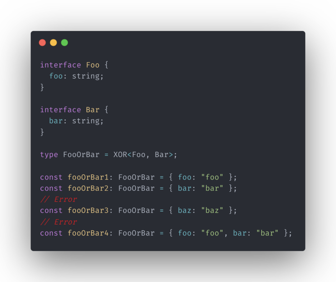 看一下具体的效果,在互斥类型中,被标注为 FooOrBar 类型的对象必须满足 Foo 与 Bar 类型之一,但不能同时满足。