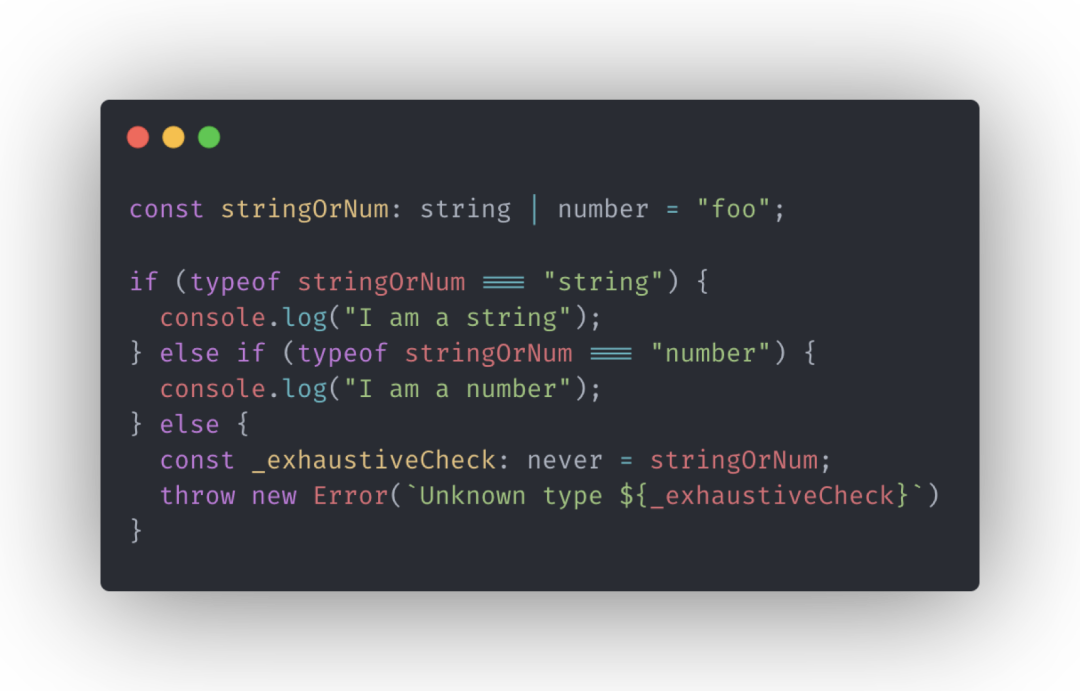 在这里的例子中,由于 TypeScript 的类型控制流分析,在走到最后一个 else 块的时候,由于这个变量的类型分支已经被处理完毕,只剩下了 never,所以这里不会抛出错误。如果新增了一个联合类型成员比如 boolean,那么这里就会同时抛出编译时错误和运行时错误。