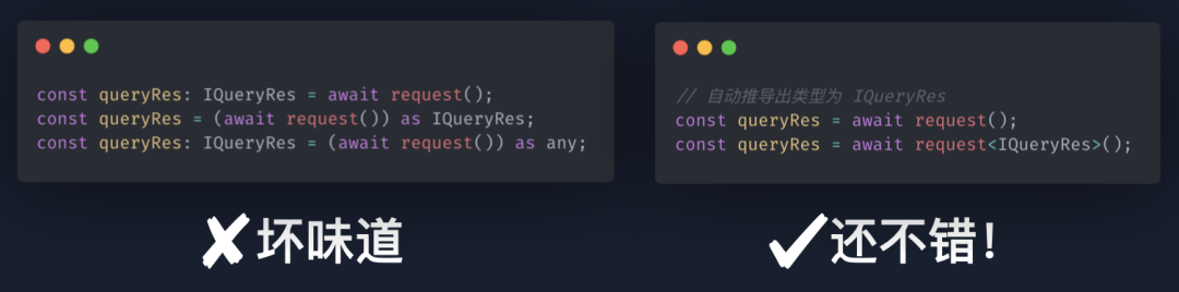 想要写好 TypeScript 类型就离不开泛型,一般来说在实际项目中我们可能会有两种使用方式,显式与隐式。先来看一个常见场景,在为请求结果声明类型时我们可能会这么做,左边的一二两种是,请求方法完全没有类型的情况,这个时候使用类型断言或显式类型标注就行,第三种则是请求方法带了类型,但经过数任维护者改动后类型已经越来越偏了,你又懒得修正实际类型,就会变成这种 as any 再 as 到实际请求类型的情况。