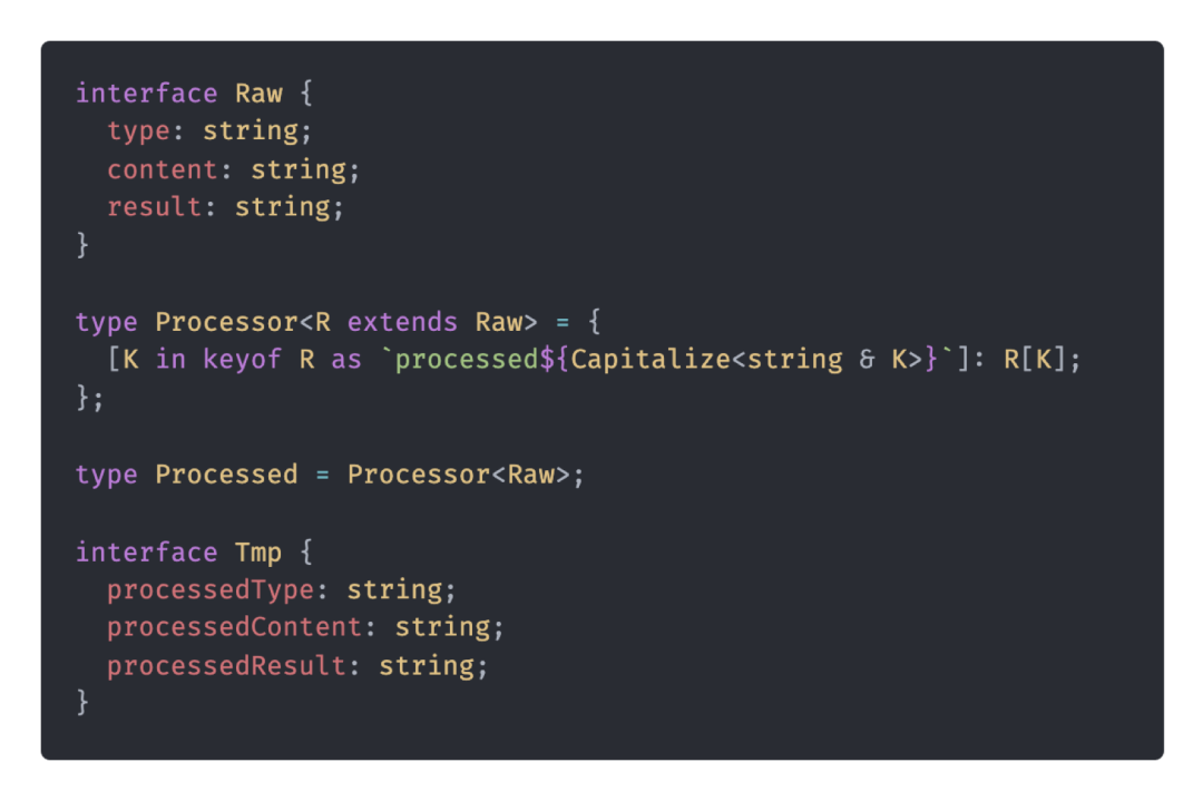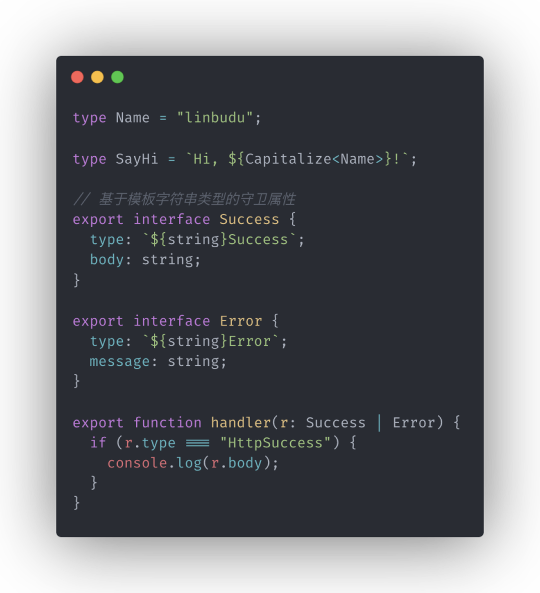 这里 type SayHi 中使用了随着模板字面量类型一同引入的专用方法 Capitialize,类似的还有其他三个专用于处理字符串字面量类型大小写 case 的内置方法。在 4.5 版本,我们前面提到的类型守卫也支持了基于模板字符串类型的守卫,如上面的例子能直接通过包含 Success 的字符串判断出来自于 interface Success。