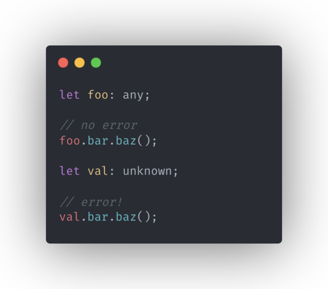 所以 TypeScript 后续又引入了 unknown,它们的最大区别是 unknown 仍然是有类型检查的,unknown 的变量在后续操作中需要手动断言,也就意味着你虽然不知道它应该是什么类型,但在这里它就是这个类型。所以 unknown 就像是类型安全版本的 any。