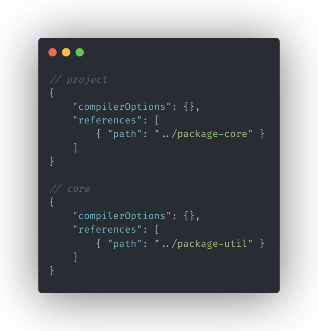 所以 Project References 就出现了,它的主要作用是使得你可以把整个 TypeScript 项目拆分成更细的粒度, 我们在上面这张图中声明了一个引用链,project 引用 core,core 引用 util,通过使用与 Project References 一起引入的新的 tsc 选项 --build,我们在 project 目录下执行 tsc--build,它会自动的最先去编译 util,然后才是 core 与 project。同时每一个部分都能确保使用自己的 tsconfig 进行编译,前端项目的话 ts-loader 同样支持了这一功能的。同时,它能精确地做到在依赖的项目更新时自动地去按需编译。
