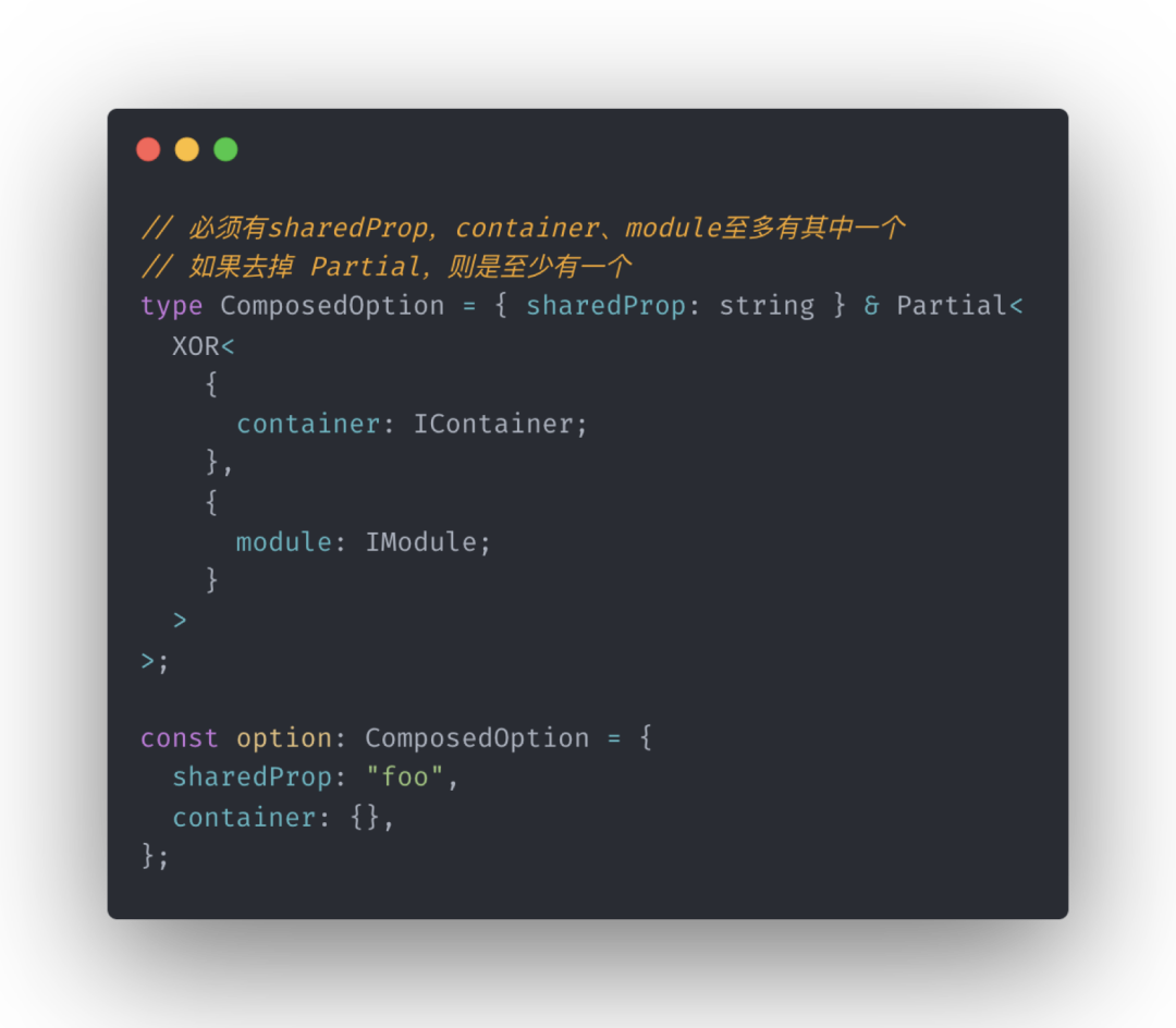 我们来看一个实际场景,互斥工具类型,常见的场景比如有某个对象只能,且必须满足多个接口之一,如登录用户和访客的信息,还有场景如某个对象中的多个属性存在依赖关系,要么同时存在,要么同时不存在。我这里直接给出具体的实现,其实最核心就是通过显式指定部分属性为 never 类型,来阻止我们不想要的类型存在。