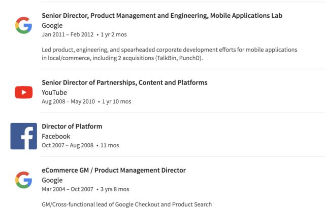 在 Facebook、YouTube、谷歌担任高管之余,他还是包括 Pinterest 等多家公司的顾问或董事会成员,也担任过社交初创企业 Badoo 的 COO。