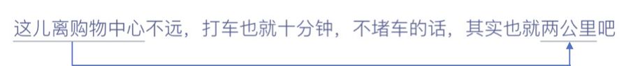 自然语言形成的文本中,常常有长距离的逻辑关联。这种逻辑关联既包含来自语言结构的依存关系,也包含语义层面上的逻辑关系,而且二者互相渗透。以下面的句子为例,它包含了一个语义信息「这里距离购物中心两公里」,但是要做出这个判断,需要跨越句头和句尾中间的距离,依靠语义上的连续性来发现前后的逻辑关联。这种逻辑关联,往往很难靠类似循环神经网络(RNN)这样的简单序列处理模型来发现和利用。