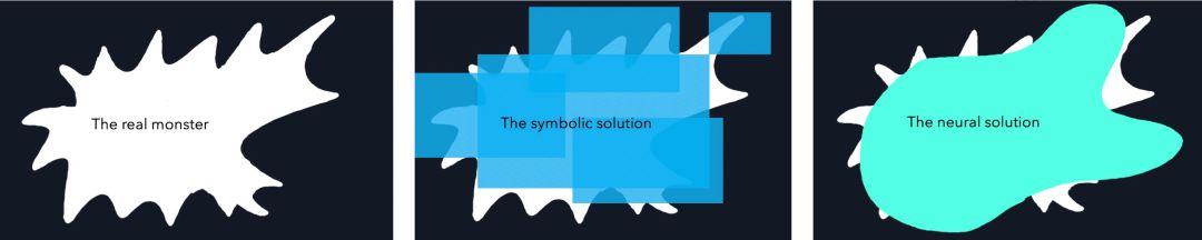从系统设计的角度,神经网络正因为牺牲了微观和主动意义上的可解释性(如设定某个节点或者某个参数的含义),转向架构和机制上的设计,从而获得了系统描述能力(expressiveness)上的灵活性。从数学的角度,神经网络可以认为是用大量参数近似地描述了大量可能符号模式的分布,从而可以用基于梯度的方法 (gradient-based methods) 来训练,但是也失去了对特定符号模式的清晰刻画的能力。我们可以用图 1 来形象地说明神经网络和符号系统是如何去近似解决同一个真实的任务的。