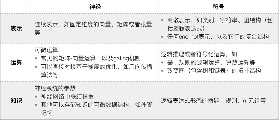 我们用下表来总结神经网络和符号智能在表示、运算和知识三个层面上的区别。