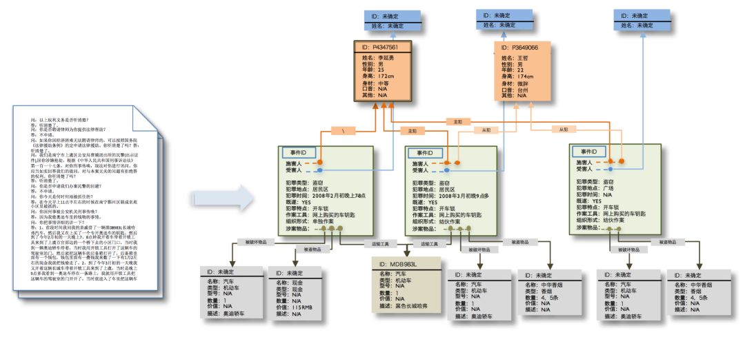 公安案情结构化:这个系统对公安侦破过程中的文本信息进行解析,构建关于案情的人-事-物-时-地的知识图谱(见图 12),让机器「懂」案情,从而为刑侦人员提供串并案、犯罪预测、信息比对及融合等决策辅助。公安案情结构化是 OONP 的一个成功应用,充分发挥了神经符号系统在解析复杂文本上的优势。公安案情结构化任务的复杂性体现在多个方面,其相关文本形式多样,叙述逻辑繁复曲折,而且最终的知识表示是包含多事件、多实体、多标签以及时空关系的庞杂图谱。为了将文本中特定的叙述习惯等知识作为规则嵌入 OONP 并获得泛化能力,我们利用了 Neural Rule Engine 来处理理解过程中的特定子任务,取得了较小数据量下的显著效果。