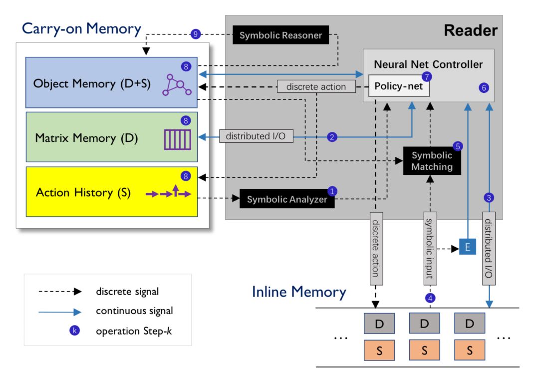 随着层数更深、更多样、表达能力更强的深度神经网络的崛起,越来越多的学者加入了对神经网络和符号智能进行结合的探索中。Jaeger 提出了一种用「Conceptors」控制循环神经网络的方式 [6],使得整个网络具有几何特性,并且可以和布尔逻辑进行有效结合。Graves 等人提出了神经图灵机(Neural Turing Machines)[7],Sukhbaatar 等人提出了记忆网络 [8],他们都引入了记忆机制来解决对推理过程中间结果的存储问题。上述方法对神经符号系统进行了进一步的探索,赋予了神经网络符号化的结构,对后续的研究有着重要的启发意义。