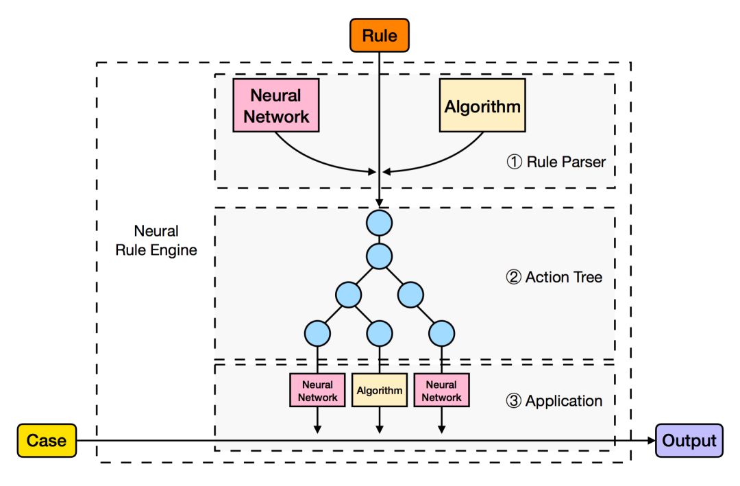规则作为人类知识的具体体现,是一种简单但是极为可靠的快速构建工业应用的手段,也是符号性知识的通用形式。规则虽然极其精确,但是其僵硬脆弱的特点又经常被诟病,比如规则可以查找「骑自行车上班」,但是语义相似的「骑小黄车上班」却无法匹配,传统的规则需要大量扩充才能涵盖这些在语义上相近的表达。我们提出的神经规则引擎(NRE),将符号性的规则知识转化为神经网络的知识形式,并辅以对应的运算。NRE 吸收了神经网络灵活性高、泛化能力强、鲁棒性好的优势,同时也维持了规则的精确性和可解释性。它可以从规则中学习知识,同时又通过神经网络来泛化知识,与人类学习知识的方式有异曲同工之妙。神经规则引擎由基础的操作和解析器来表示规则。操作和解析器根据需求既可以选用神经网络也采取符号算法来实现。具体来说,神经规则引擎先对规则用解析器进行解析,生成层级操作序列,之后依照顺序来组装模块,最后将组装好的规则应用于具体的事例,判断是否符合规则(图 5 给出了一个简略的示意图)。实验表明,借助神经网络的优势,神经规则引擎对符号知识进行了学习和扩展,可以大幅提升规则的召回率,同时还能维持较高的精确率使规则本身的特性得以保留。神经规则引擎不仅是一种新的神经符号学习范式,同时也为现有的工业应用带来了一种高效的改进,它可以被用来对已有的规则系统进行升级,或者在训练数据不大的情况下快速开发出神经规则系统 (论文见 arxiv.org/abs/1808.10326)。