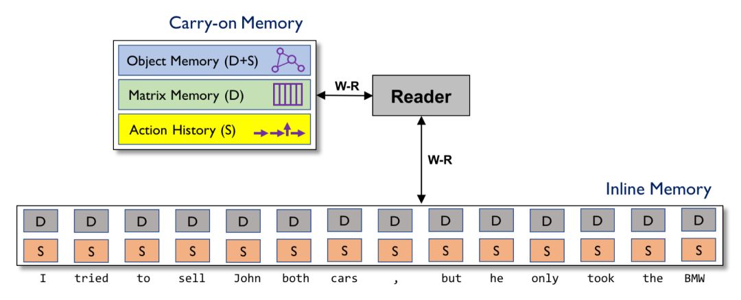 如图 9 所示,OONP 由三部分组成,分别是主控模块阅读器(Reader)、表征文档的行间记忆(Inline Memory)模块、以及总结对之前文本的理解的携带记忆(Carry-on Memory)模块。而携带记忆(Carry-on Memory)模块又可分为表征图结构的对象记忆(Object Memory)、存储连续状态的矩阵记忆 (Matrix Memory) 和记录离散动作的动作历史 (Action History) 三部分。
